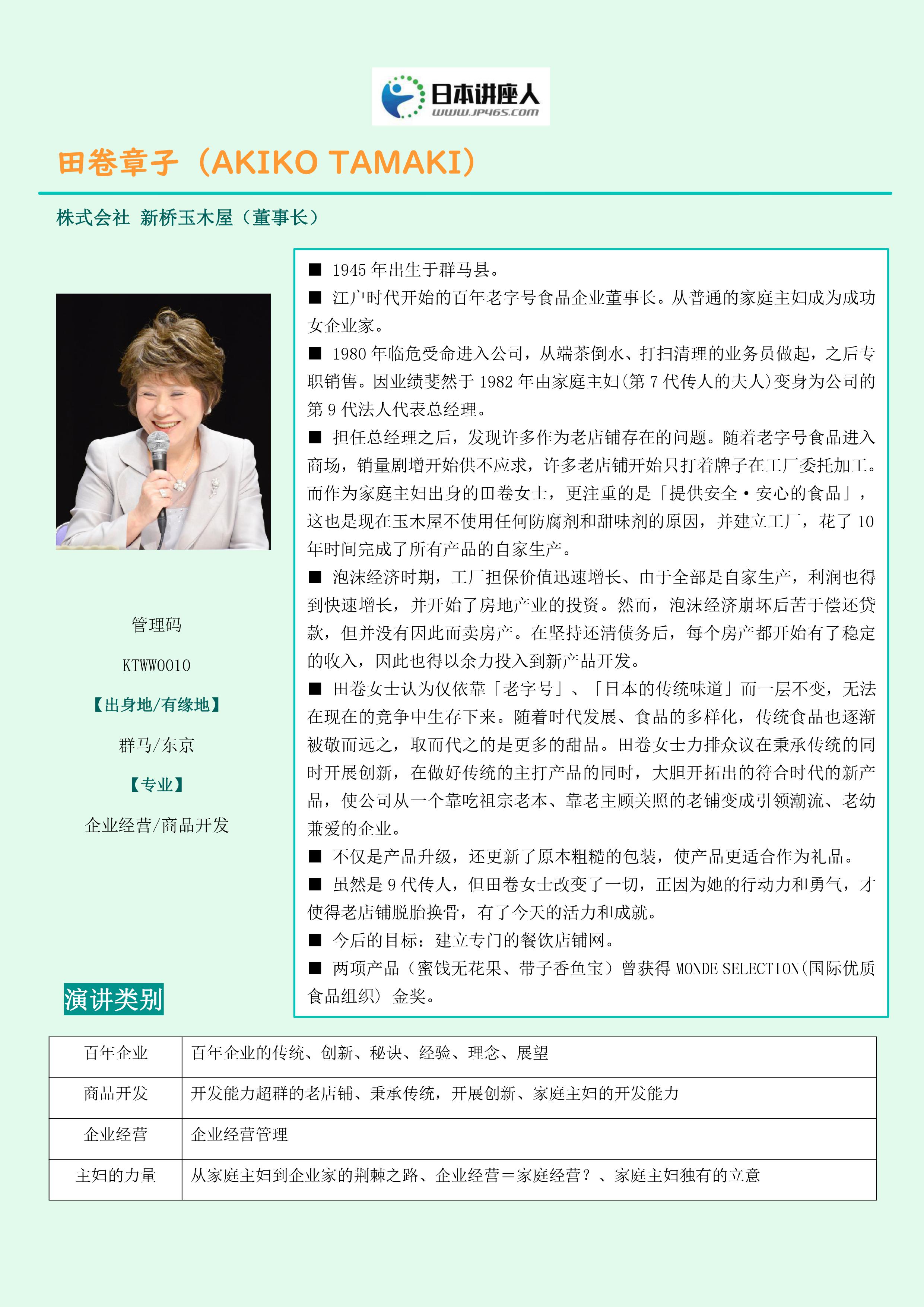 讲座内容百年企业的传统、创新、秘诀、经验、理念、展望 商品开发能力超群的老店铺、秉承传统,开展创新、家庭主妇的开发能力,企业经营管理,主妇的力量从家庭主妇到企业家的荆棘之路....